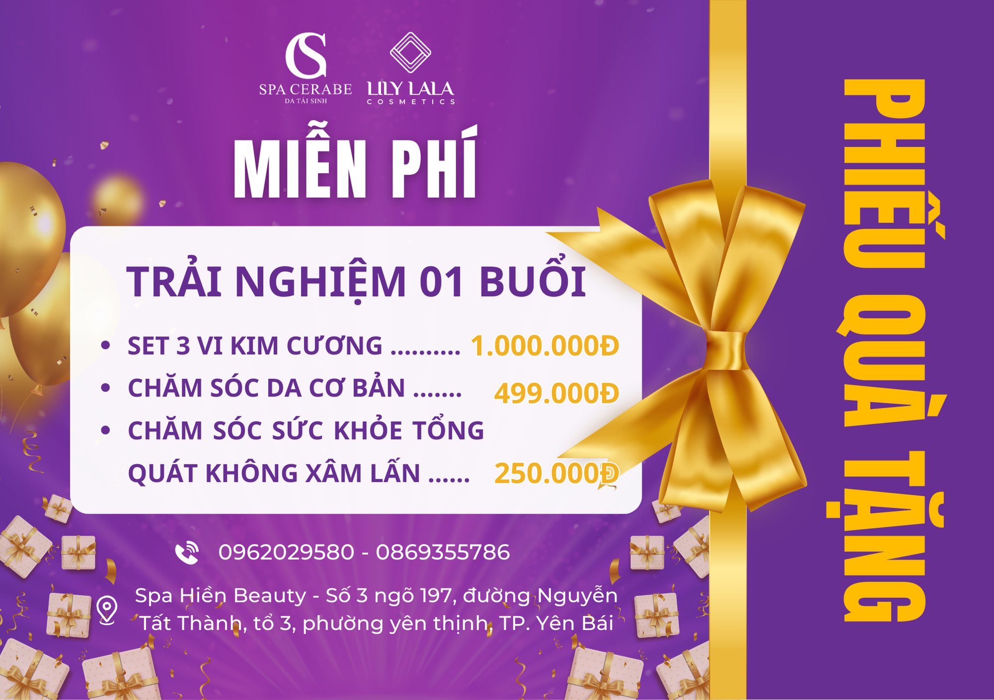 • Địa điểm: Spa Hiền Beauty – Số 3 ngõ 197, đường Nguyễn Tất Thành, tổ 3, phường Yên Thịnh, TP. Yên Bái.