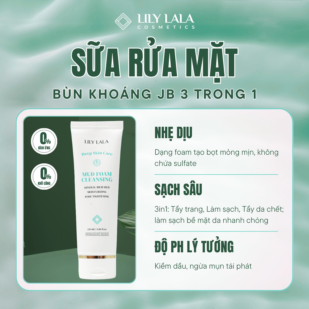 Bùn khoáng JB là thành phần chủ đạo trong sữa rửa mặt JB 3in1, giúp làm sạch sâu từng lỗ chân lông, loại bỏ bụi bẩn, dầu thừa và lớp trang điểm mà không gây kích ứng. Đồng thời, bùn khoáng còn cung cấp khoáng chất giúp da sáng khỏe, cân bằng độ ẩm và hỗ trợ kiểm soát dầu nhờn.