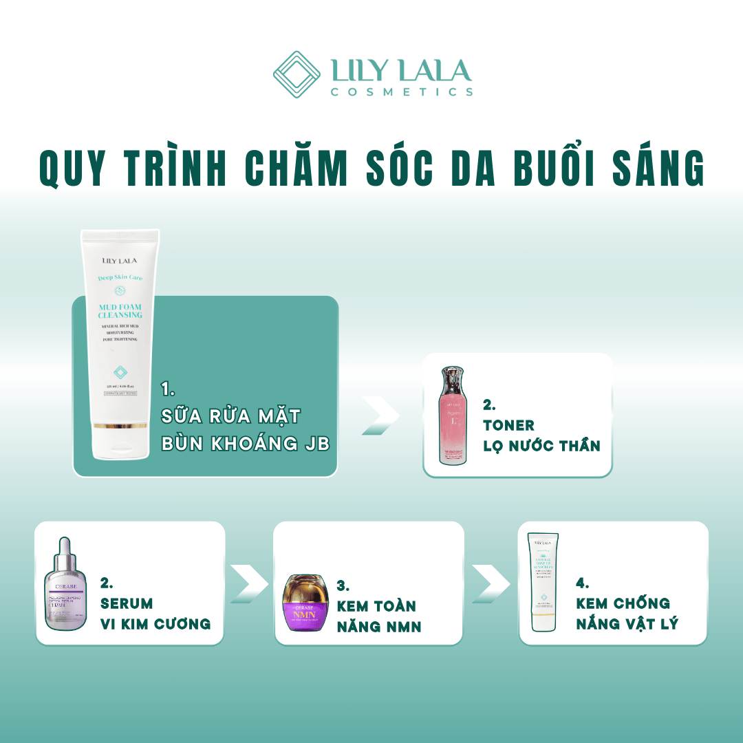 - Sữa rửa mặt – Làm sạch sâu, loại bỏ bụi bẩn và bã nhờn tích tụ trong ngày. Sử dụng sữa rửa mặt bùn khoáng JB 3in1 để vừa tẩy trang, làm sạch và tẩy da chết nhẹ nhàng.